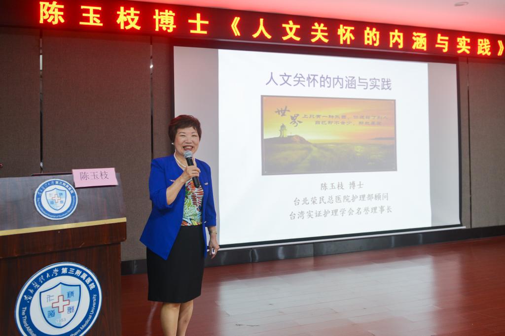 7月4日下午,第三附属医院护理部邀请台北荣民总医院护理部顾问、台湾实证护理学会理事长、国立阳明大学护理学院临床教授陈玉枝来院作《人文关怀的内涵与实践》专题讲座。护理部、各科室护士长及护理骨干共计130余人参与,讲座由护理部主任熊勇主持。