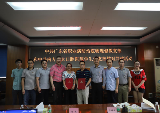 7月6日,口腔医院学生党支部全体党员、入党积极分子16人来到广东省职业病防治院(省职防院),与该院物理健教党支部结对共建开展主题党日活动。口腔医院学生党支部联系人、党委委员、副院长赵建江,省职防院党委书记、院长瞿鸿鹰参加了活动。