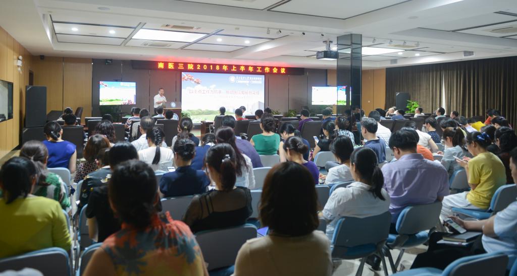 7月19日下午,南医三院召开2018年上半年工作会议。医院领导班子成员、中层干部及全体机关人员参加会议。党委书记胡海源主持会议。