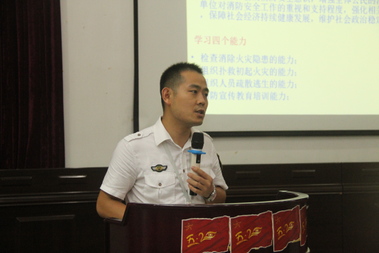 讲座中,李宝财教官向大家讲解了火灾的预防知识,通过图文、视频等方式将真实案例向大家一一展示火灾发生后的严重后果,并讲解发生火灾后的安全疏散与逃生知识,以此提醒在场的每个人关注身边的安全隐患,敲响大家心中消防安全的警钟。李教官向大家讲解了消防器械的正确使用方法,包括灭火器、防毒面罩、逃生绳等。
