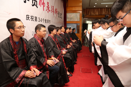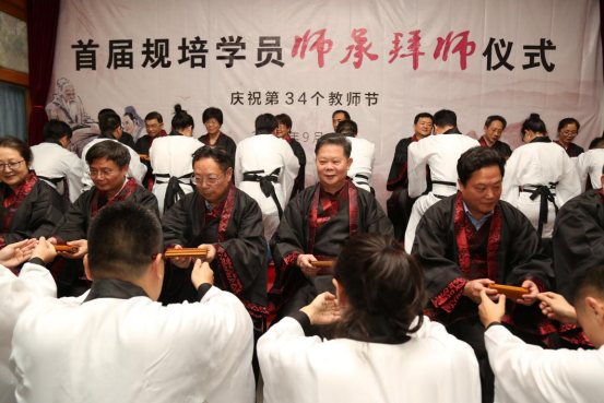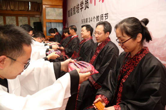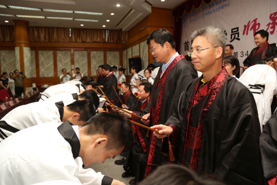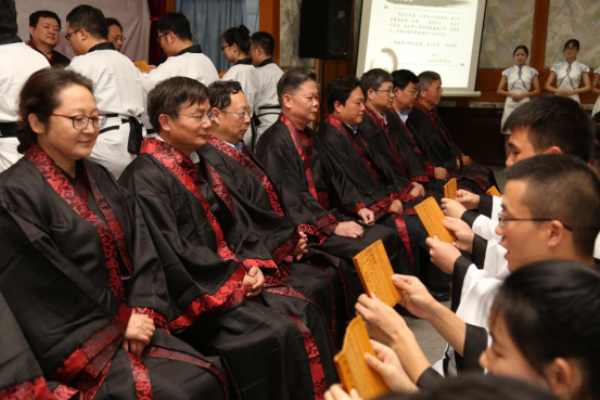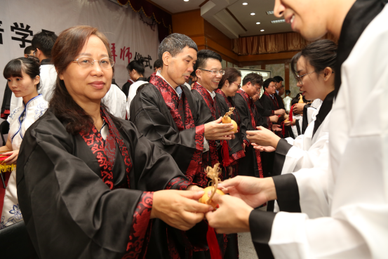 戒尺加身(诸位导师将用刻有《弟子规》的戒尺轻敲弟子,以告诫诸位弟子,在今后从医求学的路上应该恪守规范。“一敲头”告诫弟子头脑清醒,敬业乐群。“二敲肩”寓意弟子肩负重任,继承衣钵。