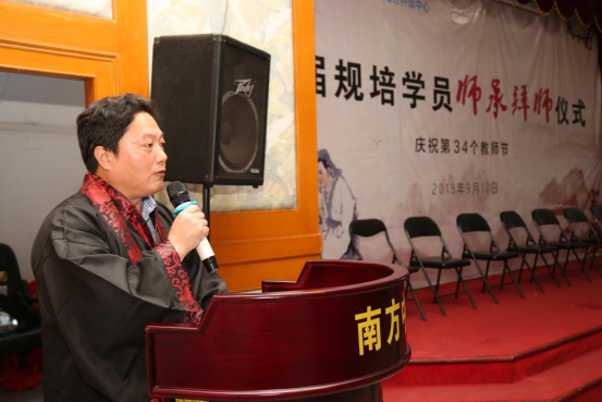 会议开始,副院长彭康宣读了基地师承教育指导老师及继承人名单。基地汇聚南方医科大学中医名师,经过前期动员筹备,精心遴选出58位师承导师(其中我校中西医结合医院38名,中西医结合医院住院中医师规培协同单位阳江市中医医院10名,惠州市中医医院10),经过沟通了解,双向互选,全体规培学员和心目中的导师均已达成意向。仪式现场庄严肃穆,20名弟子向师承导师行跪拜礼、递交“拜师帖”,奉赠束脩六礼,呈敬礼茶,表达了对老师的敬意,答谢老师收于门下,也表明了自己发奋努力、立志继承老师学术思想的决心。