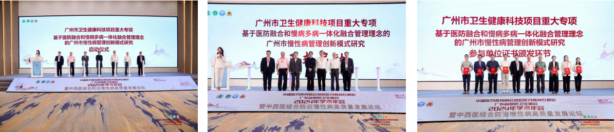 经广州市卫生健康委员会批准立项,中医药学院、中西医结合医院联合广州市疾控中心以及海珠、白云等多家基层医疗机构创新性的提出了医防融合和慢病多病一体化融合管理的新模式。大会特别举行了“慢性病管理的广州方案”启动仪式,由中国疾控中心慢病中心主任吴静、国家卫健委医院管理研究所处长肖革新、中西医结合医院党委书记陈旭坚等共同启动广州市卫生健康科技项目重大专项“基于医防融合和慢病多病一体化融合管理理念的广州市慢性病管理创新模式研究”,并向参与单位颁发证书。