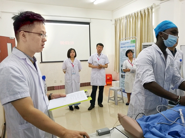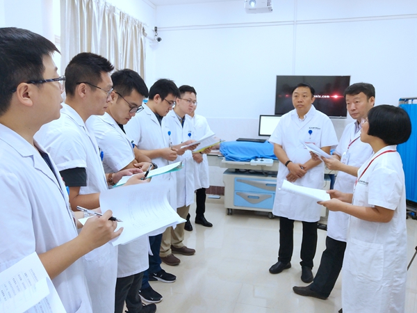 上午7点15分,国家医学考试中心处长王钢一行及中南大学湘雅三院唐晓鸿、中国医科大学附属第一医院姜元军携带本次考试题卡及评分册莅临中心,并全程督导。心血管介入技术考核30名考生,抽签分为10组,每组三人(共三间考室)同时开考;膀胱镜技术考核共20名考生,抽签依次考试(1间考室);考官分别由珠江医院心血管内科及泌尿外科经验丰富的临床医师担任。整个考核过程全程录像,考试流程严格遵照国家医学考试中心的规范。