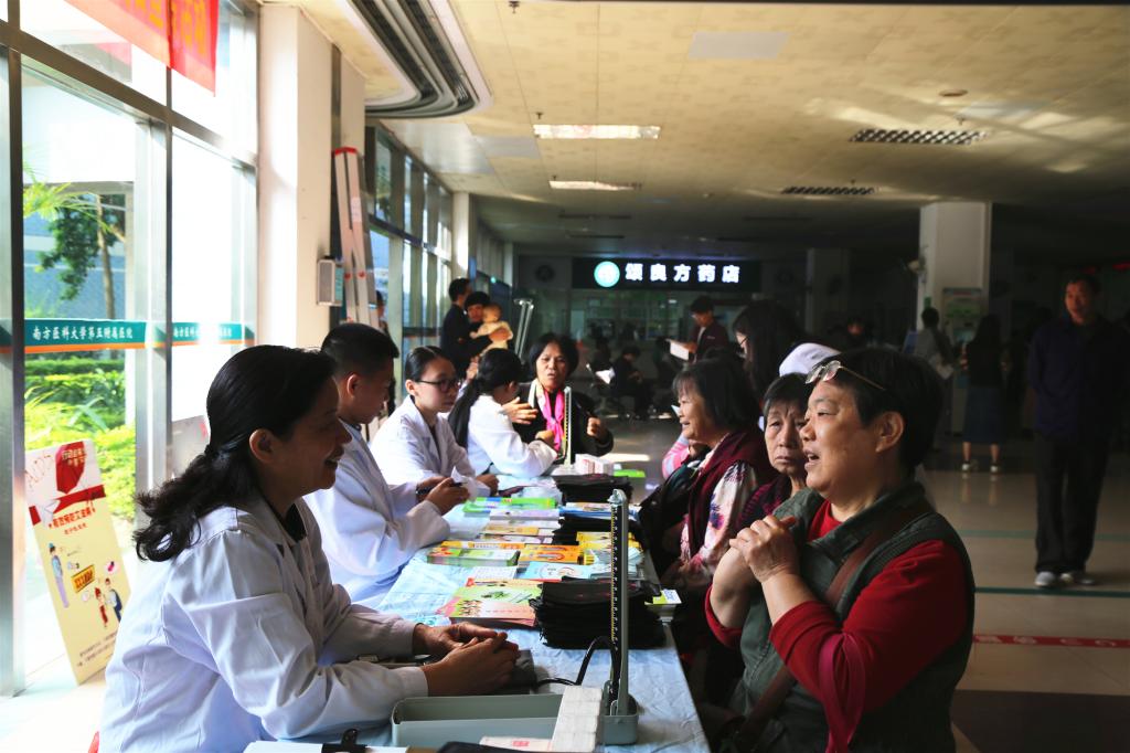 朱阿姨的家人在医院住院,听说这里举办义诊活动,就过来现场咨询,并顺便测量一下血压。李翠珍为她测量后,发现她的血压有点高,就提醒她到本院的专科门诊就诊,做好防治。听说她家里有年迈的亲属需要长期服药和需要照顾2岁半的外孙女,在她临走前,工作人员向她赠送了印制艾滋病宣传知识的小药盒、证件袋、纸巾和幼儿图书等礼品,她连声感谢。