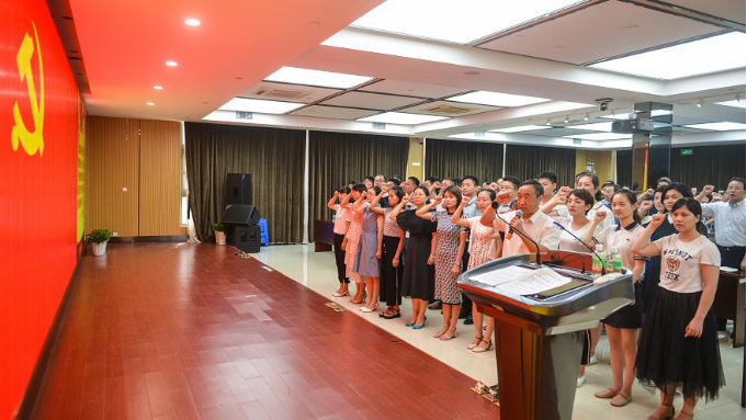 大会在庄严的《国歌》声中开幕。党委副书记、院长蔡道章领誓,新党员作入党宣誓,全体与会党员同志面向党旗重温入党誓词。