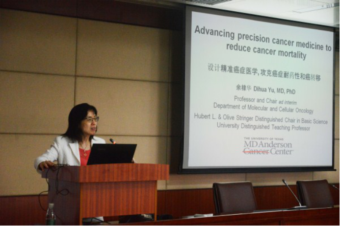 余棣华教授是美国M.D.安德森癌症中心终身教授,分子与细胞肿瘤学系主任,肿瘤中心功能基因组学项目主任,癌症生物及代谢组学项目主任。讲座中,余教授介绍了其团队针对三阴性乳腺癌的两大挑战——耐药性和脑转移的研究成果,及对最新的三阴性乳腺癌的激酶靶向药物的筛选研究进展,深入浅出的介绍了精准医学时代的癌症研究热点及发展趋势,同时分享了如何培养科研思维和解决科研问题能力的经验。