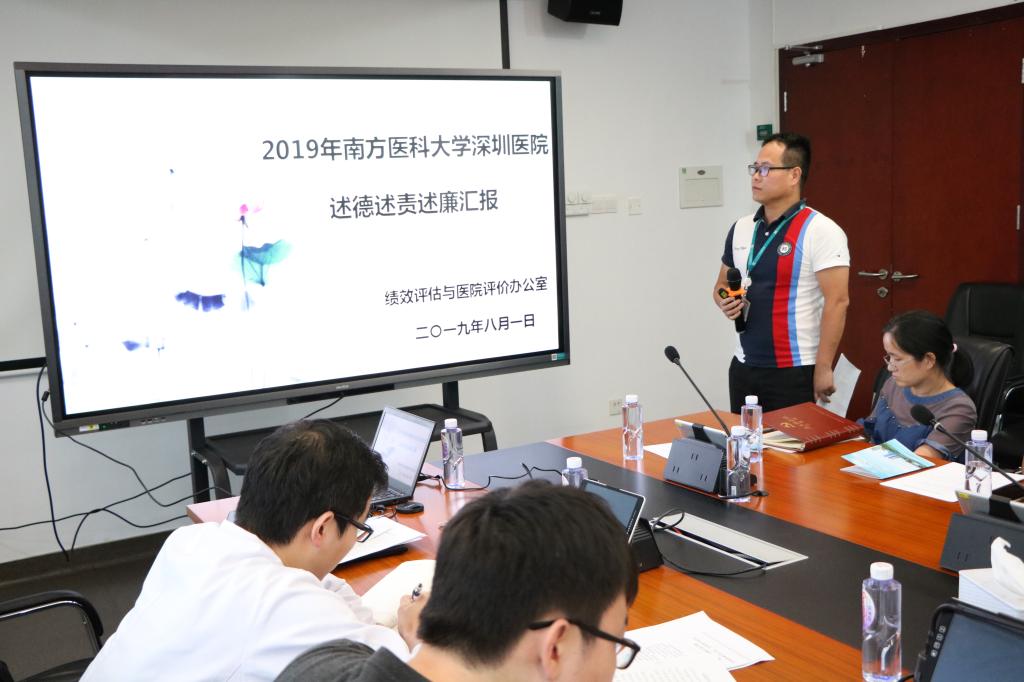 为深入推进“不忘初心、牢记使命”主题教育,进一步加强医院党风廉政建设,提升高风险管理岗位人员廉洁自律意识和风险防控能力,8月2日下午,南方医科大学深圳医院召开2019年第三次纪委委员(扩大)会议,听取高风险管理岗位述德述责述廉,医院纪委委员、各党支部纪检委员、党风廉政建设监督员、高风险管理岗位负责人及纪检监察室工作人员共50人参加会议。