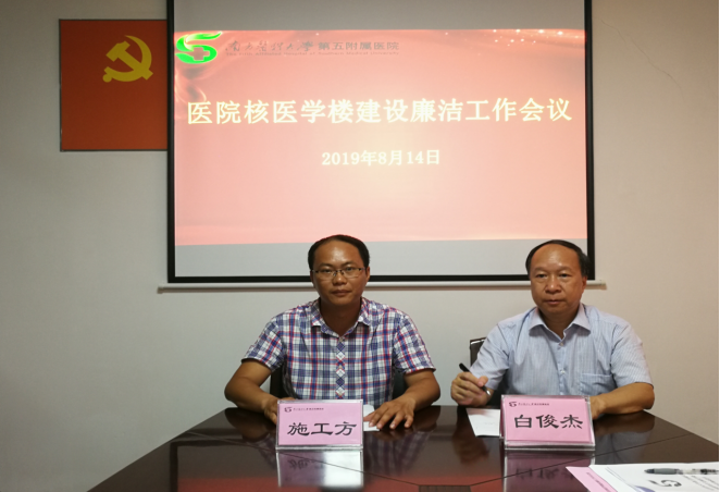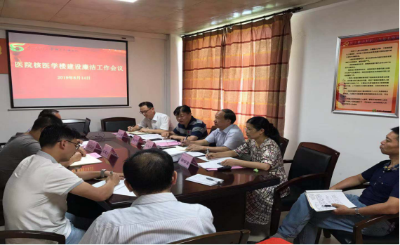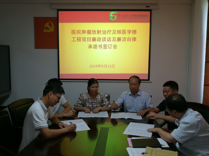 8月14日下午,五附院召开肿瘤放射治疗及核医学楼工程项目廉政教育及廉洁自律承诺书签订会,院领导、工程建设领导小组成员、基建工程管理人员、工程施工单位项目经理、监理单位负责人等10多人参加了会议。会议由医院分管工程基建副院长白俊杰主持。