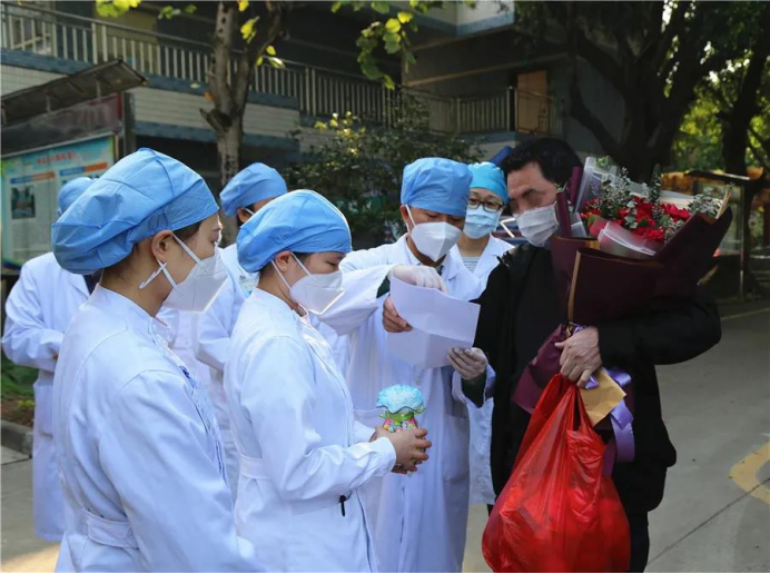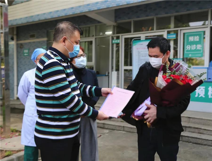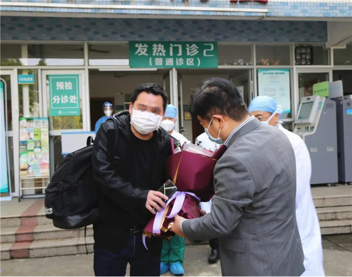 3月10日上午,医院为患者举行了简单的欢送仪式。院领导为他送上了鲜花,祝福他治愈出院。