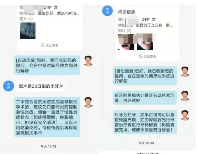 线上答疑解惑,开通免费义诊咨询。结合口腔医院专科门诊诊疗情况的特殊性,为满足广大患者的就诊需求,互联网医院自2月3日起开通口腔疾病线上免费义诊咨询,60余名专家主动报名参加线上免费义诊咨询。截止3月1日,专家完成了免费订单量1737个,日均处理60余例咨询。专家不仅在医院规定的上线接诊时间内为患者解决问题,在规定时间外仍不停地为患者答疑解惑,专家耐心详实的解答,得到患者的一致好评。
