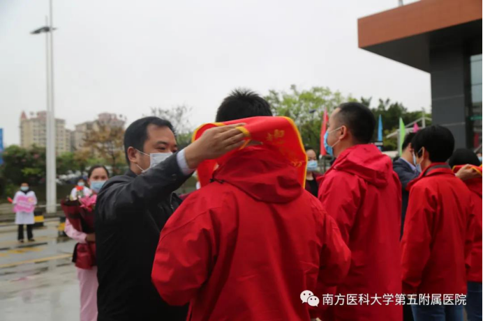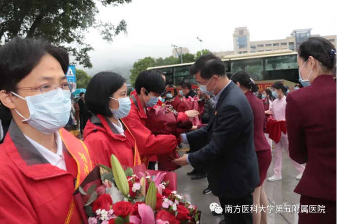 车队到达南医五院云星楼门前以后,队员们陆续走下车,在场等候的各领导立即迎上前去,深情地对大家说:“你们辛苦了!”随后为队员们戴上印有“从化援鄂最美逆行者”字样和医疗队员姓名的绶带,并献上芬芳的鲜花。