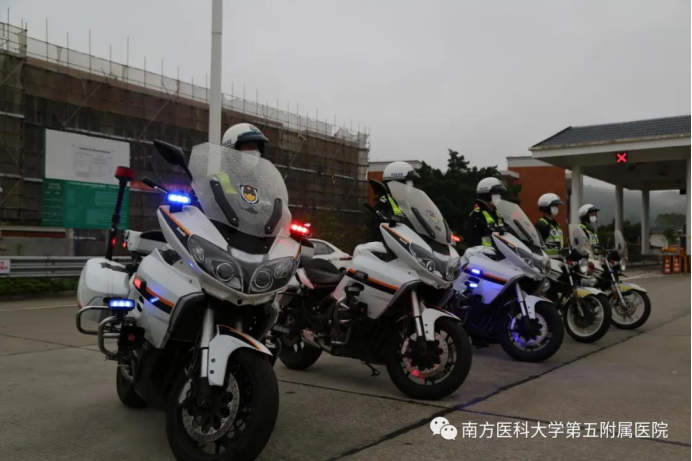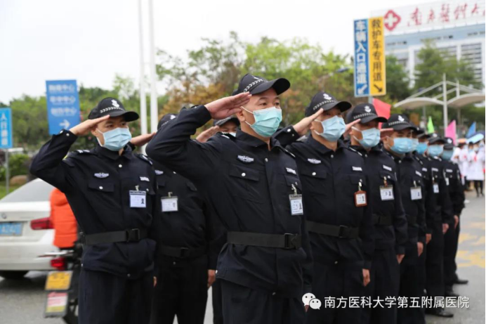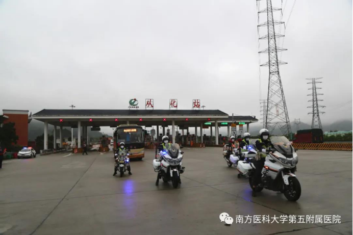 医疗队员乘坐的车辆到达大广高速从化出口后,“向抗疫英雄致敬!”交警列队向队员们敬礼致意,并用铿锵有力的口号欢迎大家回到家乡。