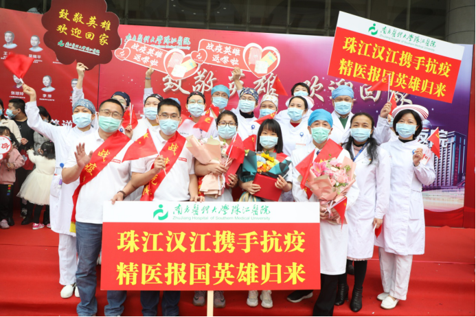 “报告王前书记、院长,珠江医院援鄂医疗队圆满完成任务,队员无伤病,全体平安返回。”4月5日,伴随着队长王华铿锵有力的汇报,南方医科大学珠江医院援鄂医疗队15名队员结束14天的休整,平安返回珠江医院。广东省卫健委副主任周紫霄,南方医科大学副校长高天明,珠江医院全体院领导,同事、家属等热情迎接。 自1月24日除夕夜紧急奔赴武汉,时隔73天,这群“逆行”英雄终于回到熟悉的地方,与同事、亲友团聚。
