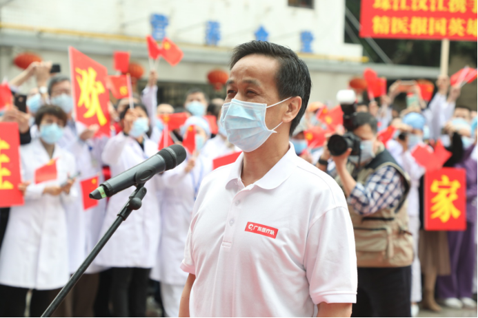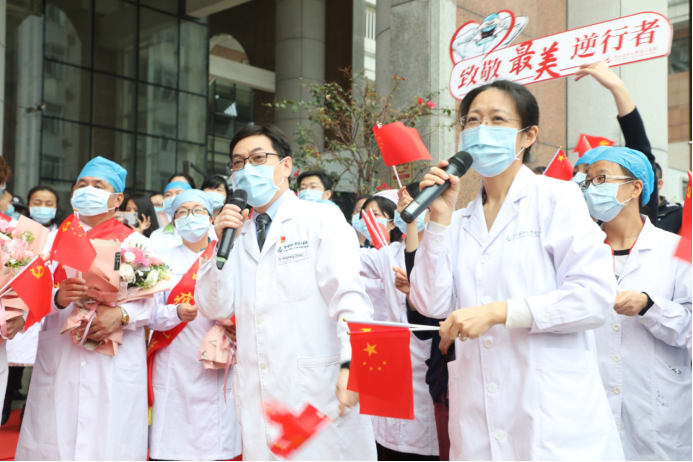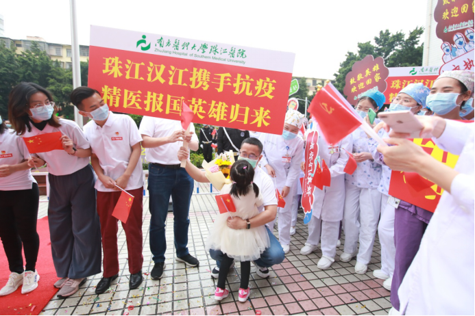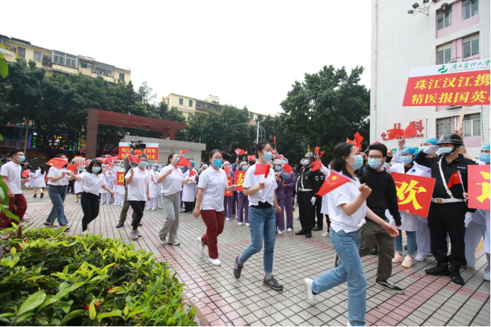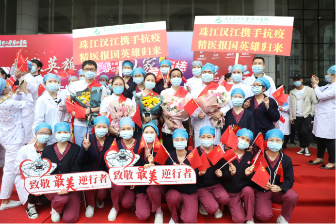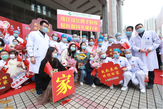 “春风杨柳万千条,六亿神州尽舜尧。红雨随心翻作浪,青山着意化为桥。”珠江医院党委书记、院长在欢迎仪式上,用一首《送瘟神》,代表全体教职员工向医疗队致敬。他表示,队员们用仁心仁术和“珠医”精神阻击疫情、挽救患者,用爱心捐赠帮助社区民众,为打赢湖北疫情防控阻击战作出了突出贡献,充分展现了“珠医战士”的担当和责任。