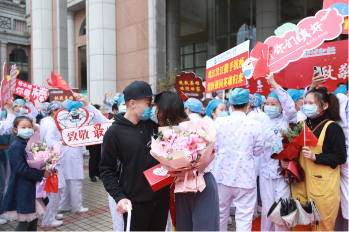 “亲一个,亲一个。”队员郑爽欢在儿科中心同事们的热情欢呼下,与老公肖俊南隔着口罩亲吻。“70多天,就一直很想老公,要一起去吃各种好吃的。”早已列好回家必吃清单的郑爽欢说。
