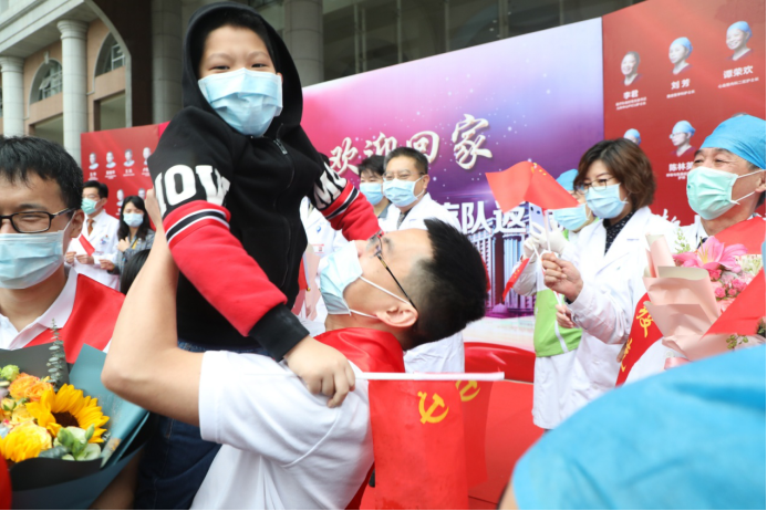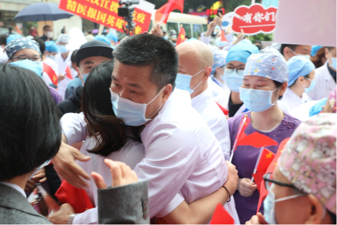 从没离开家这么长时间的队员吴锡平,迎来了太太肖莉和儿子一个大大的拥抱。因太太也是珠医院护士,疫情期间无法照顾两个孩子,小女儿在老家由老人照顾,8岁的大儿子因要上网课、做作业,便在老师家里由老师照顾。“抽个时间亲自去接回女儿,然后一家四口去拍张全家福。”吴锡平说。