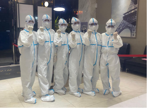 4月4日,医疗队开始承担隔离酒店工作。刚到酒店,医疗队队长李婷就组织队员们对酒店的工作人员和安保人员进行防护培训,告知大家如何在工作中保护好自己。随后,医疗队开始布置酒店各个区域,划分出污染区、清洁区、隔离区等,营造了一个安全规范的工作环境。