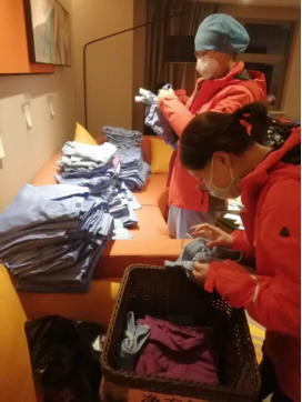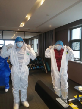 刚来武汉前几天,我一直负责协助护士长管理后勤工作,协助指导队友们穿脱防护服的培训、考核,必须人人过关。因为穿着隔离衣事关工作的防护的重大关系,我严格要求每一位队员必须过关,不能有丝毫的放松,每次考核完毕,我身上衣服已经被汗水打湿了一层又一层。另外,我还协助感内感染控制工作,即酒店大厅、各自房间如何划分区域(污染区、半污染区、清洁区、绝对清洁区),并挨个检查各房间物品的摆放及分区情况,做好酒店感控的每一个环节。每天还负责给队友们把热好的饭菜送去每个房间,并询问队友们的生活习惯、身体是否有不适情况等。我还是一名伤口造口师,帮助解决戴N95口罩引起压红、压疮、心理压力等问题,提供有效的防护措施。