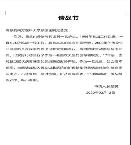 2020年春节期间,我从各大媒体得知新型冠状病毒肺炎在湖北等地肆虐,心里很不是滋味,我想我在2003年中有抗击非典的经验,而且还获得“抗非典先进个人奖”,以我的经验可以在这场与病毒抗争中发挥出来,另外我想若有机会我会毫不犹豫地去尽我的一份力量。于是早早就向医院党委递交了请战书,时刻准备着投入这场没有硝烟的“疫”中去。
