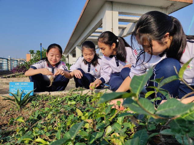 赤岗东小学学生精心照护中药苗。(来源:南方医科大学)