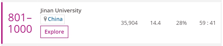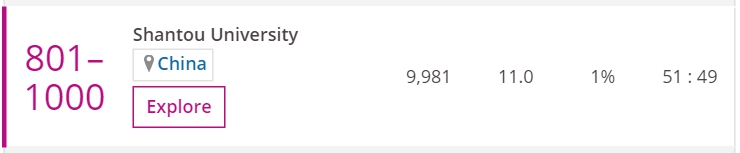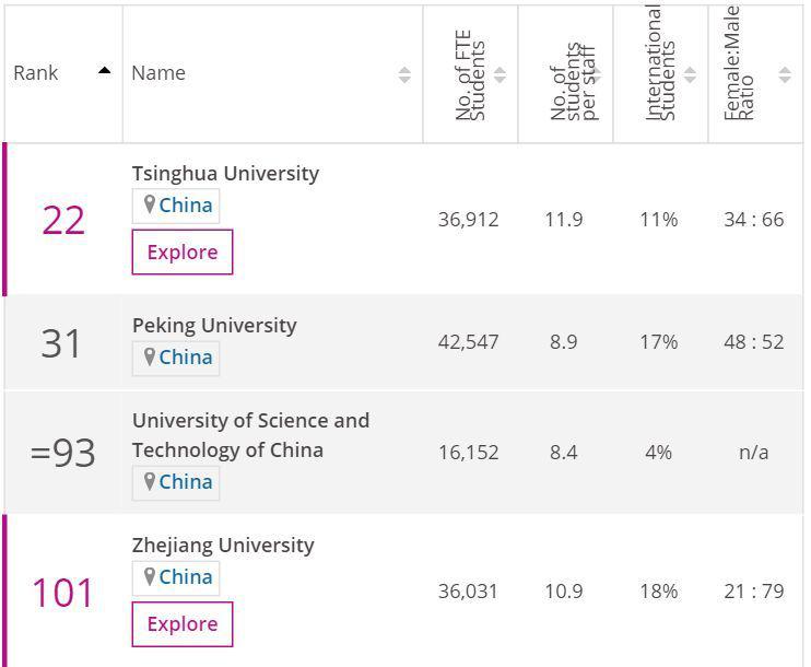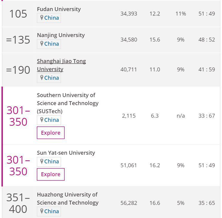 浙江大学由于教学环境和学习环境得到改善,研究收入和行业收入增长,研究数量和国际学生比例增加,名次上升76名,排名第101。南开大学也是首次入围,排名在351名到400名之间,这主要归功于其研究影响力一项得分较高。