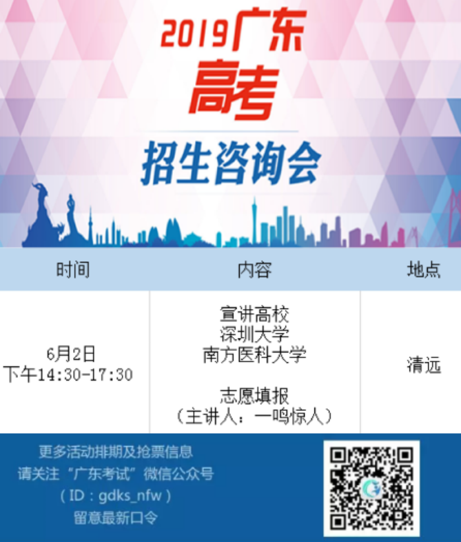 6月2日(本周日)下午,2019广东高考招生咨询会——清远专场将如期开讲!
