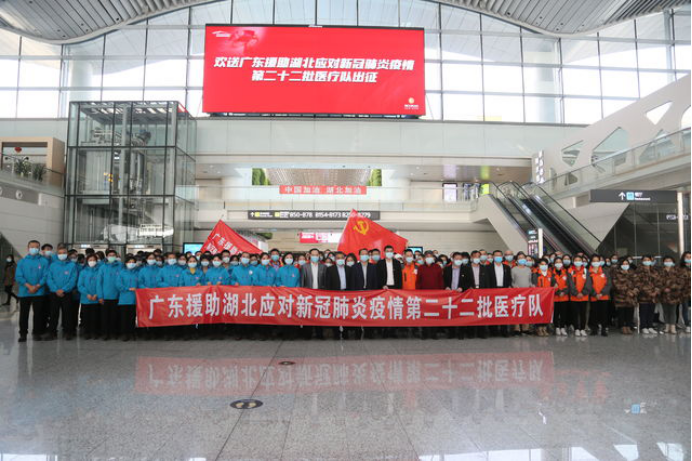 2月21日,广东省第22批援助湖北医疗队出征,驰援武汉开展医疗救治工作。该批医疗队分两组,共176名队员,由广州市第一人民医院副院长余纳任领队。