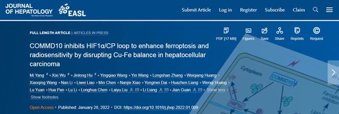 近期,南方医院放疗科官键教授团队在国际顶级学术期刊Journal of Hepatology上在线发表了题为“COMMD10 inhibits HIF1α/CP loop to enhance ferroptosis and radiosensitivity by disrupting Cu-Fe balance in hepatocellular carcinoma”的研究论文。作者以肝癌作为主要研究对象,发现细胞内铜蓄积可促进肝癌放疗抵抗。肝癌细胞内常伴随内源性铜代谢相关蛋白COMMD10缺失,后者加剧了细胞内铜离子蓄积,从而进一步加重肝癌的放疗抵抗。铜螯合剂可逆转上述放疗抵抗作用。机制探索发现,COMMD10低表达导致的细胞内铜离子蓄积可抑制HIF-1α泛素化降解,促进HIF-1α核转位从而增加铜蓝蛋白转录翻译,进而形成HIF-1α/CP正反馈调控环路,抑制细胞铁死亡,从而促进肝癌的放疗抵抗。