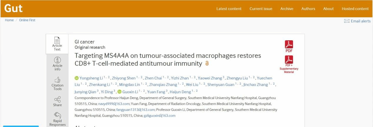 近期,南方医院普外科李国新、邓海军教授团队在国际顶尖的胃肠病学期刊GUT(中科院SCI分区小类1区)上在线发表了题为“Targeting MS4A4A on tumor-associated macrophages restores CD8+ T-cell-mediated antitumor immunity”的原创科研论著。其中南方医院普外科博士后李永盛、副主任医师沈智勇、硕士研究生柴振和博士后詹益芝为论文共同第一作者;放疗科方媛医师、普外科李国新教授、邓海军教授为论文共同通讯作者。南方医院作为本论文的唯一署名单位,其系列工作得到多项国家自然科学基金项目的资助支持。