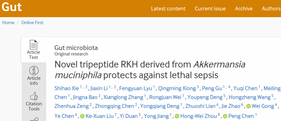 8月8日,基础医学院陈鹏、姜勇团队、珠江医院周宏伟团队及中国科学技术大学段屹团队共同在Gut在线发表题为“Novel tripeptide RKH derived from Akkermansia muciniphila protects against lethal sepsis”的研究论文。