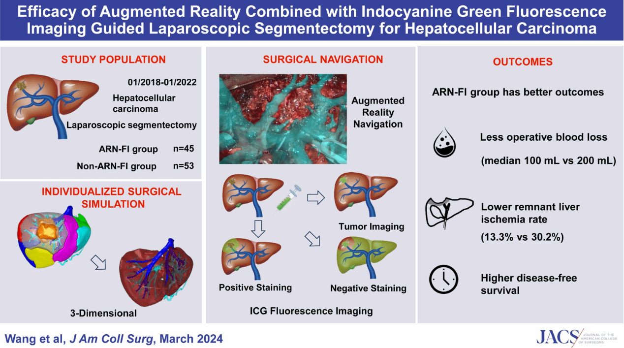 图1:论文《Perioperative and Disease-Free Survival Outcomes after Hepatectomy for Centrally Located Hepatocellular Carcinoma Guided by Augmented Reality and Indocyanine Green Fluorescence Imaging: A Single-Center Experience》的视觉摘要: