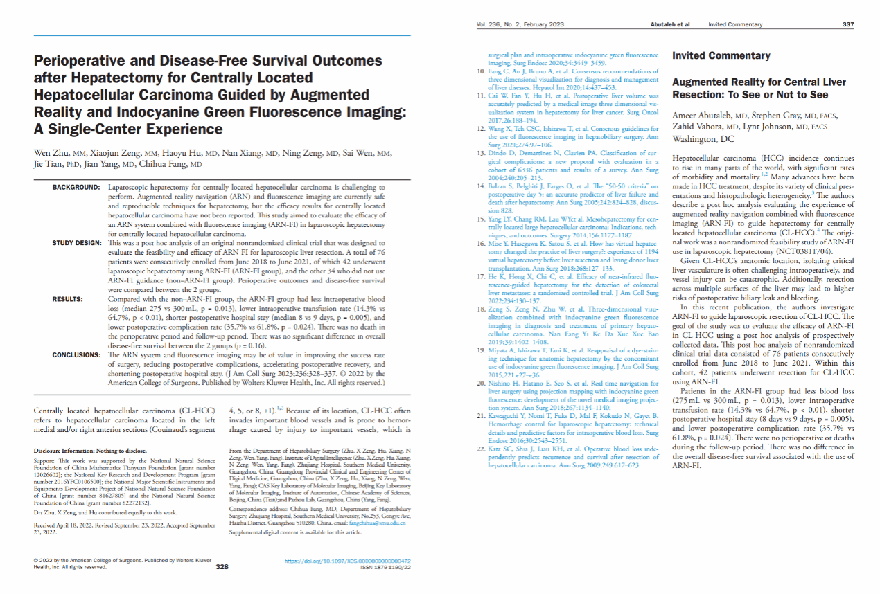 近日,珠江医院肝胆一科方驰华教授团队在Journal of the American College of Surgeons(J Am Coll Surg美国外科医师学会,外科一区)连续发表临床研究成果。发表论文"Perioperative and Disease-Free Survival Outcomes after Hepatectomy for Centrally Located Hepatocellular Carcinoma Guided by Augmented Reality and Indocyanine Green Fluorescence Imaging: A Single-Center Experience"(增强现实和吲哚菁绿荧光成像指导下的中心型肝癌肝切除术后围术期和无病生存结果:单中心经验),祝文主治医师和专业型博士研究生曾小军为论文共同第一作者,方驰华教授为通讯作者。