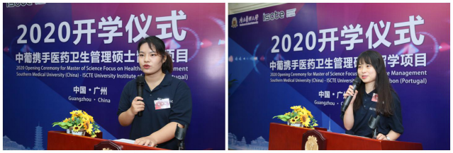 来自我校医学英语专业的新生代表崔若娴,结合了本科学习体会,分享了加入项目的初衷,她希望通过自身在项目的学习以及多元的教学方法的配合下能够和大家共同进步;另一位新生代表王菲入读中葡硕士项目之前,已有丰富的工作经验。她谈到,没有完美的计划,只有通过努力,才有完美的人生。现在,新的旅程正式开始,期待未来与硕士大家庭一起奋斗。