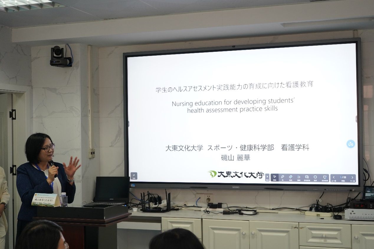 磯山丽华以《提升健康评估技能的护理教育》为题展开讲座。她先以日本老龄化现状引入主题,介绍日本看护课程的设计与教学目标,并分享学生在社区家庭情境中开展临床思维训练的实例。