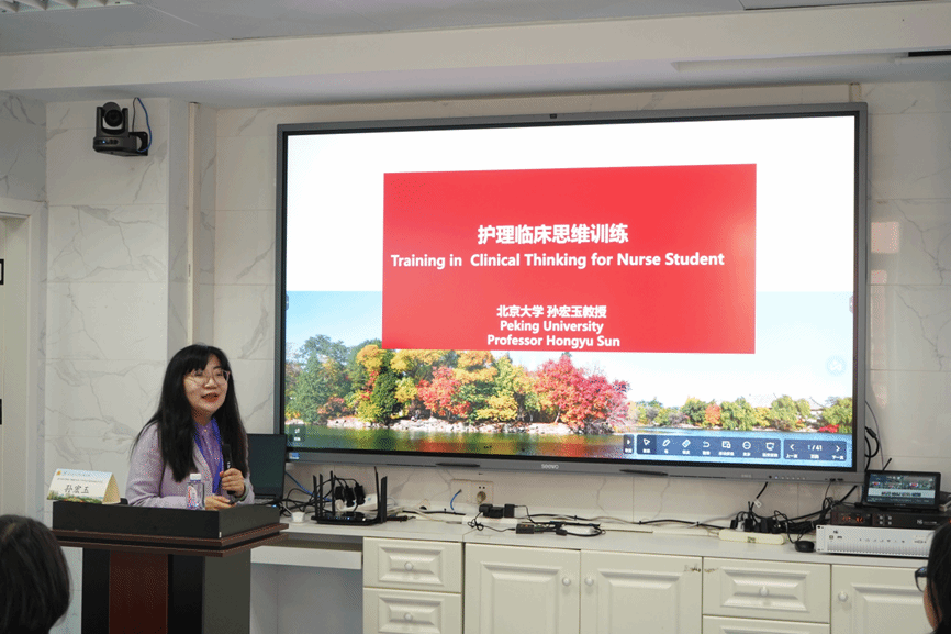 专家报告环节由护理学院副院长史蕾主持。孙宏玉以《护理临床思维训练》为题展开讲座。她介绍了中国护理教育体系,从课程设置、教学方法、临床思维、实习带教四个方面分析如何推动护理临床思维教育改革,分享了已在国内开展的护理临床思维训练工作坊实践项目,并对护理教育数字化建设提出展望。