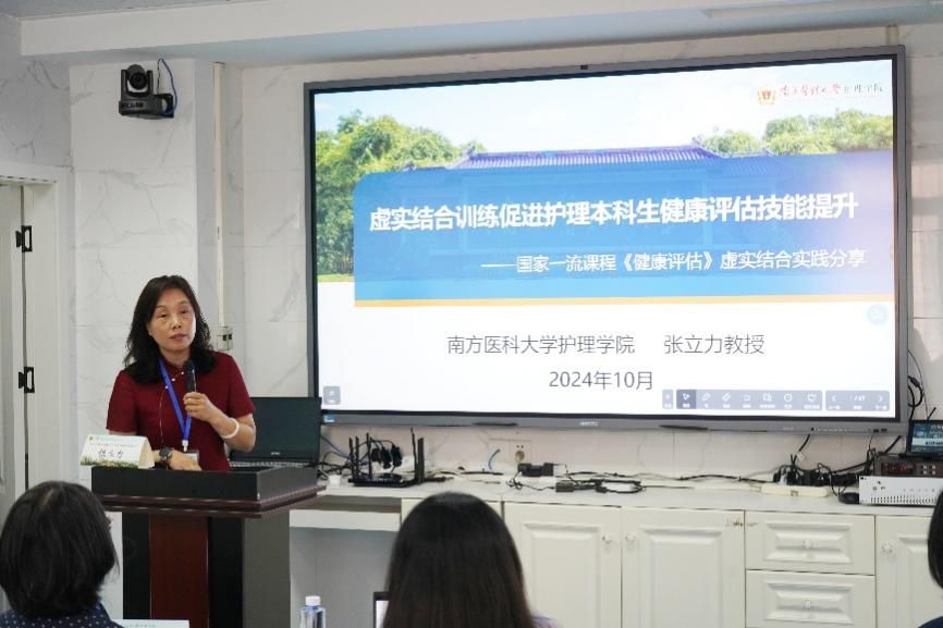 张立力以《虚实结合训练促进护理本科生健康评估技能提升》为题作精彩授课。她结合自身经历介绍了《健康评估》课程建设的发展历程,分享了学院基于信息技术和大数据开展的基于知识图谱、数字化临床技能教学平台与临床实践一体化的《健康评估》虚实结合教学实施方案。