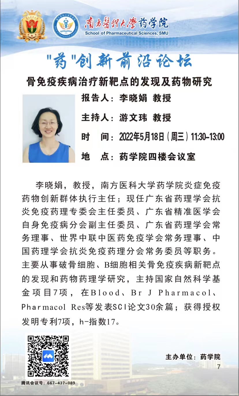 主讲人简介:李晓娟,教授,南方医科大学药学院炎症免疫药物创新群体执行主任;现任广东省药理学会抗炎免疫药理专委会主任委员、广东省精准医学会自身免疫病分会副主任委员、广东省药理学会常务理事、世界中联中医药免疫学会常务理事、中国药理学会抗炎免疫药理分会常务委员等职务。主要从事破骨细胞、B细胞相关骨免疫疾病新靶点的发现和药物药理学研究,主持国家自然科学基金项目7项,在Blood 、 Br J Pharmaco1、Pharmacol Res等发表SCI论文30余篇;获得授权发明专利7项,h-指数17。