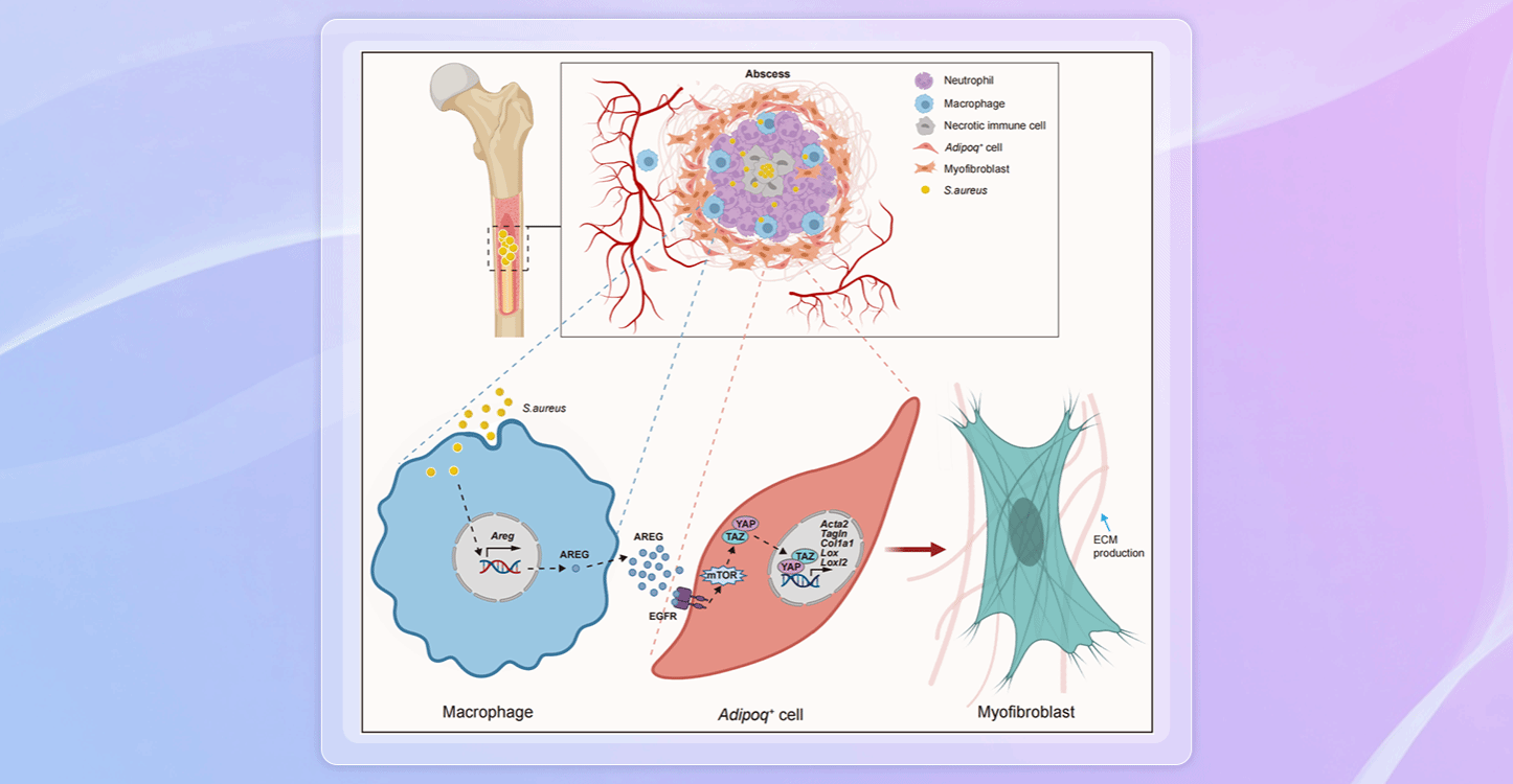 近日,学校张先荣、余斌、白晓春团队首次揭示了一条由巨噬细胞—双调蛋白(AREG)—脂肪前体细胞(MALPs)—EGFR/mTOR/YAP信号轴驱动脓肿周围纤维化的新机制,为增强抗生素疗效提供了新思路。金黄色葡萄球菌(Staphylococcus aureus)引起的骨髓炎是骨科术后和开放性骨折后最棘手的问题之一。尽管使用强效抗生素,感染仍易复发,其主要原因在于骨髓内细菌脓肿的形成。这些脓肿周围常形…