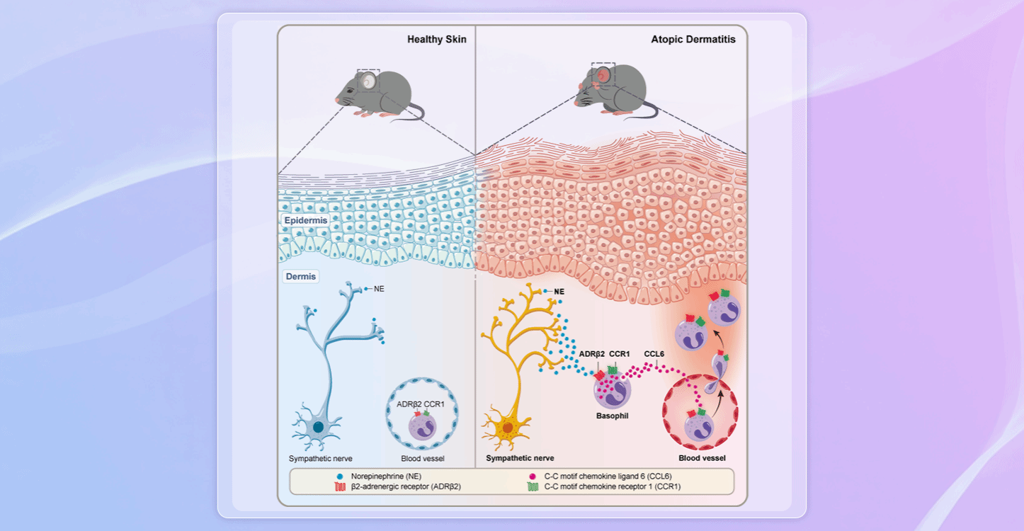 特应性皮炎(AD)作为困扰全球数千万患者的慢性皮肤疾病,其反复发作的瘙痒与炎症反应长期与焦虑情绪相伴。然而,情绪如何通过特定通路直接加重皮肤炎症,始终缺乏明确机制证据。近日,皮肤病医院教授王芳、珠江医院教授李风仙联合中山大学附属第一医院团队揭示特应性皮炎诱发的焦虑情绪通过“交感神经—嗜碱性粒细胞轴”直接放大皮肤炎症反应的分子机制,为临床治疗提供了全新方向。特…