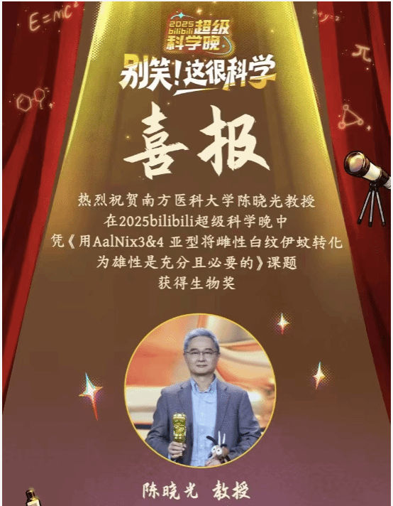 2025年10月31日晚,由bilibili主办的“超级科学晚”在北京拉开帷幕,我校陈晓光教授团队凭《用AalNix3&4 亚型将雌性白纹伊蚊转化为雄性是充分且必要的》课题获得2025bilibili超级科学晚生物奖,并做了《终极灭蚊:给蚊子做“变性手术”》的演讲。