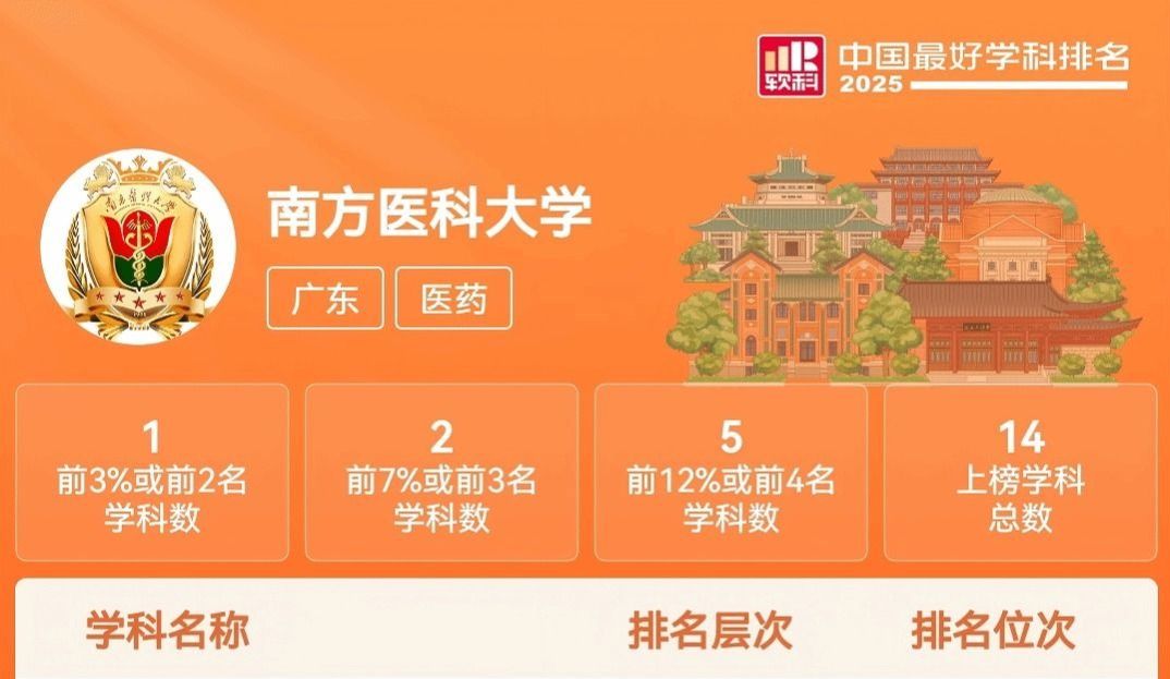 近日,“2025软科中国最好学科排名”发布,我校16个学位授权一级学科中,共有14个进入榜单,总上榜数位列全国医药类大学第1。其中,法医学一级学科首次参加软科排名,我校位列全国第2,入围“中国顶尖学科”行列,系广东省进入榜单的9个顶尖学科之一。此外,我校基础医学全国排名第4,入围“中国一流学科(前7%)”,临床医学、公共卫生与预防医学和中西医结合入围“中国一流学科(前12…