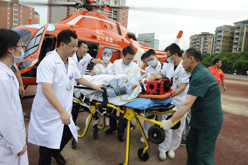 南方医院急诊医学科实施航空医疗救援8月15日下午,南方医科大学操场上空再一次响起轰鸣声,金汇空中救援的直升飞机盘旋下降,一位危重患者从东莞市人民医院抵达我院。南方医科大学南方医院急诊医学科李旭主任带领危重症救护团队与转运队员迅速交接,为转移到救护车上的患者进行必要的紧急处置后,将患者送达急诊医学科抢救室进一步治疗。据南方医院急诊医学科主任李旭介绍,这名患者是一位从东莞市人民医院转来的危重症少…