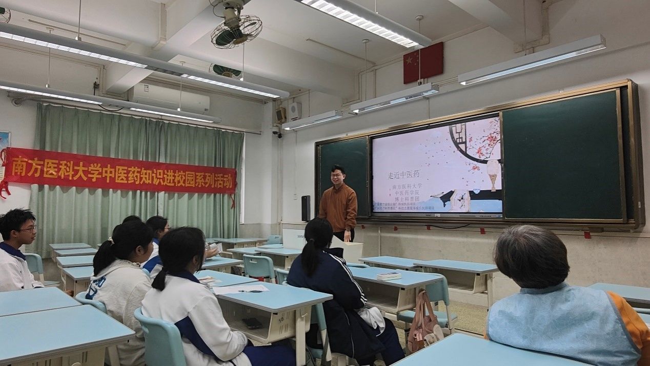 3月15日下午,中医药学院博士科普团继续前往广州市第一中学(高中校区),开展本学期首次中医药知识进校园活动。博士科普团以生动有趣的形式展示了中医药的基础理念、经典医家以及简单应用,让同学们对中医药的世界充满了好奇和兴趣。活动首先以一个精彩的中医药科普小视频拉开帷幕,视频主要讲述了中医药的来源、传承和发展的内容。随后,博士团队成员温锦杰向大家提出问题:“中医四…