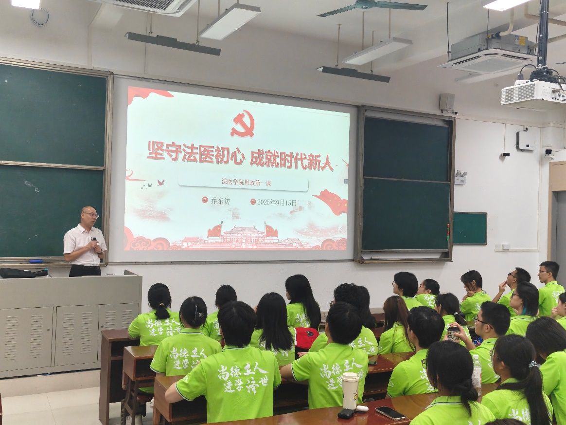 9月15日,法医学院副院长乔东访以“坚守法医初心,成就时代新人”为题,为2025级法医学专业新生讲授了一场深刻而富有启发的“思政第一课”,引导新生深刻理解法医学专业的崇高使命与责任,筑牢专业思想根基,系好大学生涯的“第一粒扣子”。乔东访结合当前时代背景与国家需求,指出法医学在维护司法公正、捍卫生命尊严、促进社会和谐中发挥不可替代的重要作用,强调了新时代对高素质法…