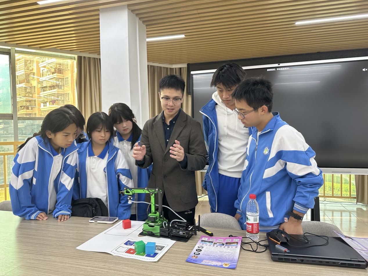 近日,韶关市曲江第一中学的校园里迎来了一场别开生面的科普盛宴。生物医学工程学院积极响应 “双百行动”号召,组织人工智能专业团队走进曲江一中,为这里的师生们带来了一堂聚焦机器人具身智能技术的前沿讲座。电子技术系教师杜俊杰博士携“Jetmax 三自由度机器人”,用生动的讲解与精彩的演示,在中学生心中播种下了探索科技奥秘的种子。当机器人拥有“身体与智慧”“如果机器人能像…